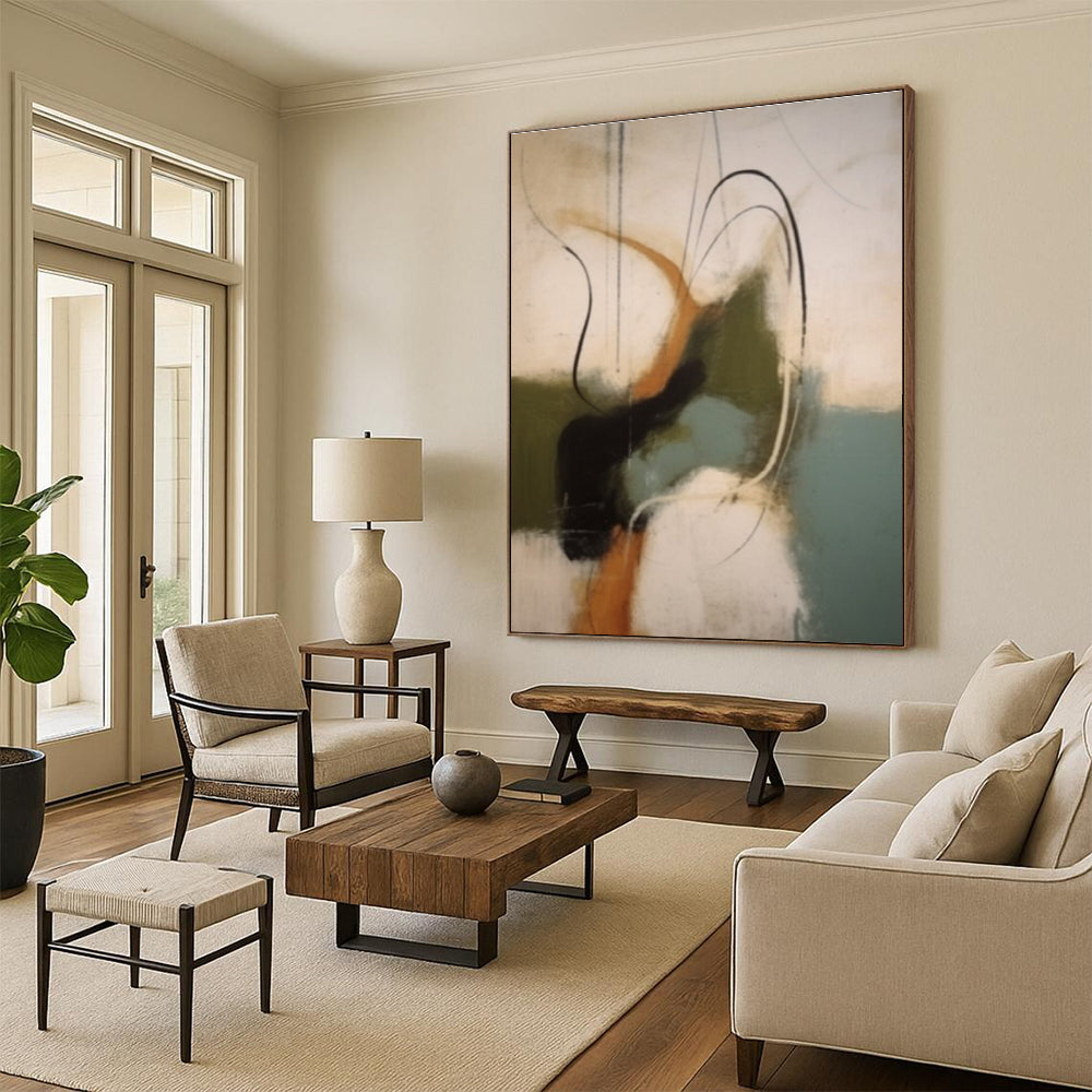 Modern Art Acrylic in Black, White, Brown, Green, and Teal Abstract Movement Shapes Painting PT267