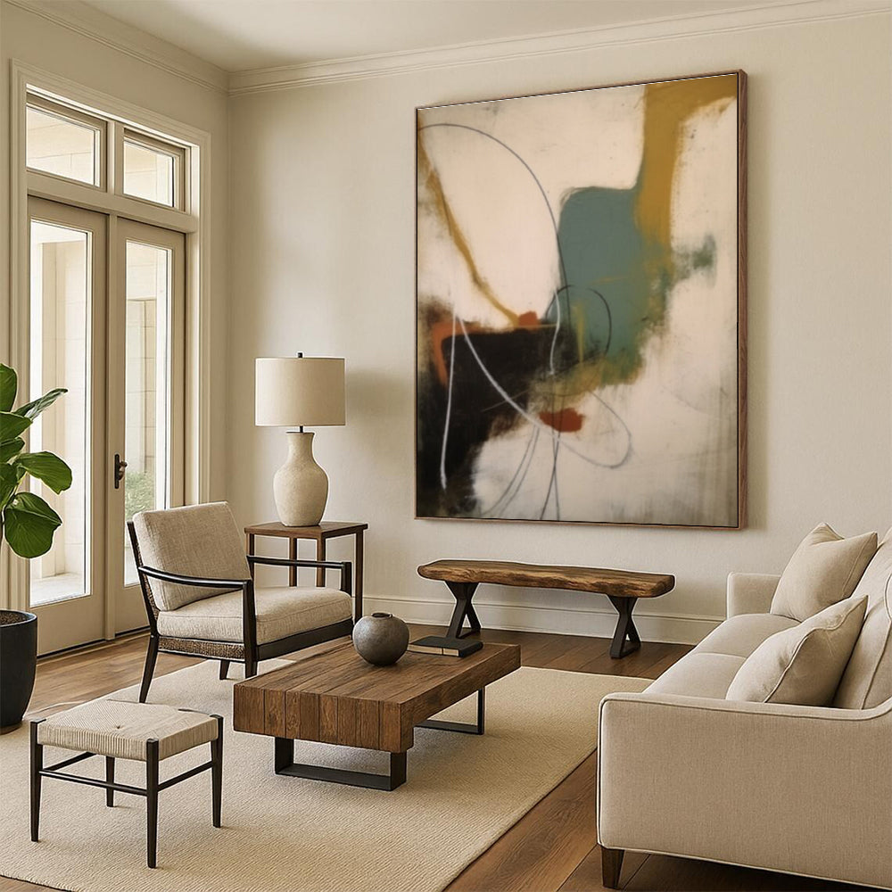 Unique Abstract Art in Black, White, Brown, Teal, and Orange Abstract Shapes and Lines Painting PT266