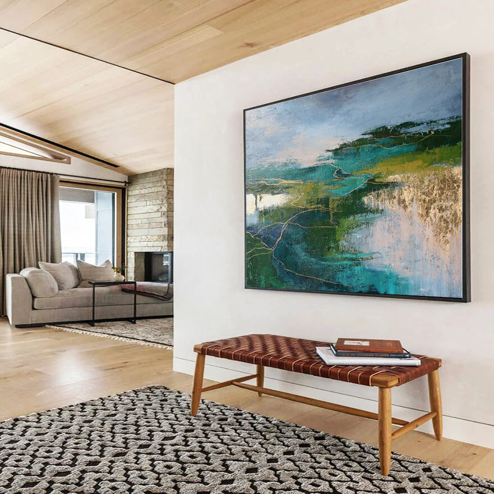 Unique Abstract Art Teal & Green Landscape With Gold Lines Abstract On Canvas HPS043